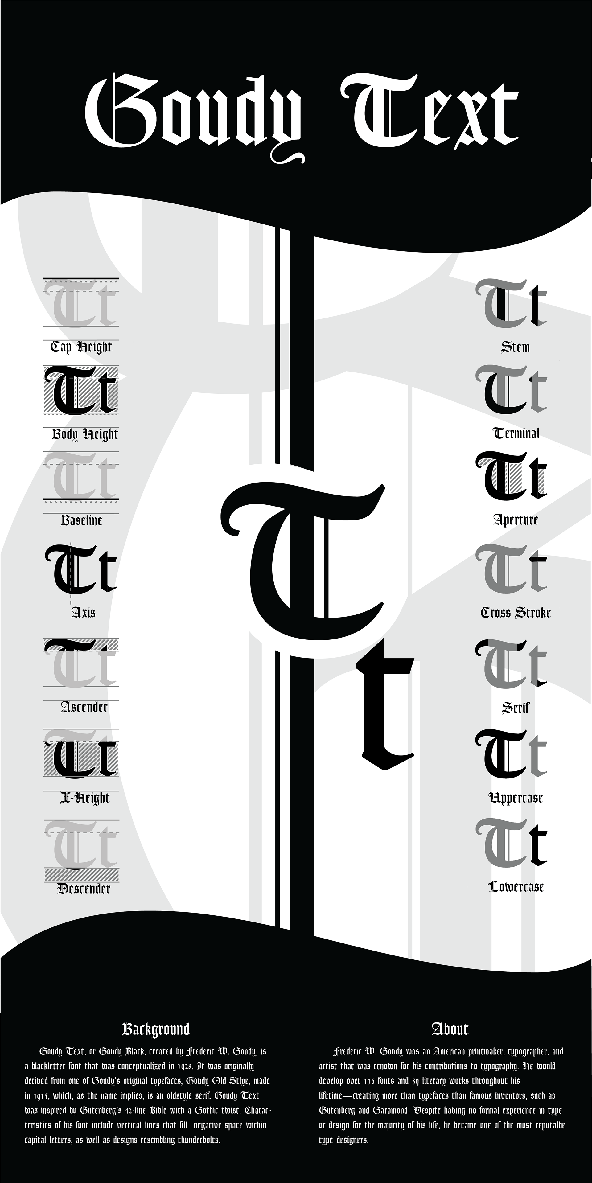 This project explores the type anatomy of the Goudy Text font. I chose to abstract elements of the letter "T" as the background elements to further call to attention the font's calligraphic nature.
