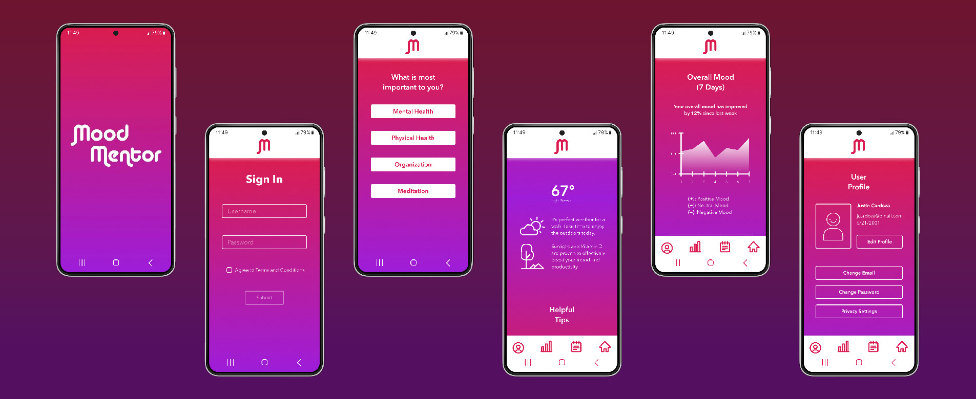 Mood Mentor is an app designed in Figma that is meant as a virtual tool for monitoring and tracking an individual's mood over time. It is built with accessibility in mind, passing WCAG AA color contrast standards.