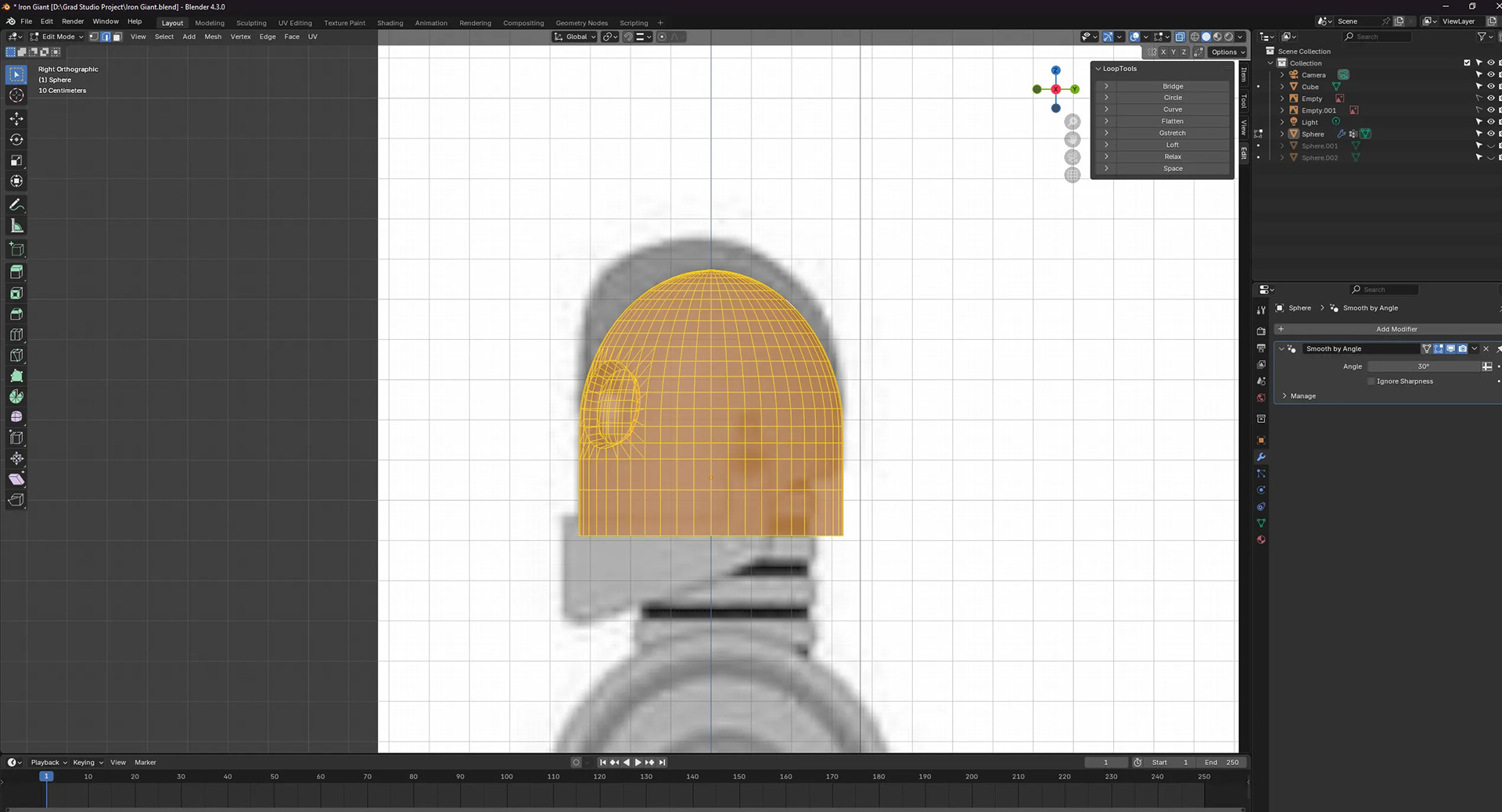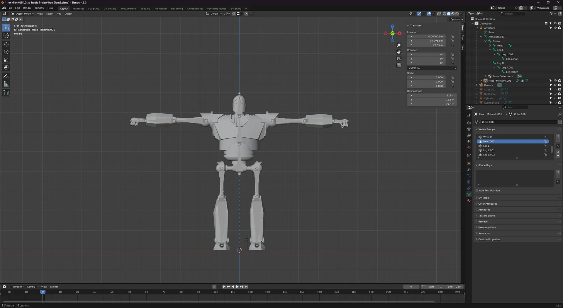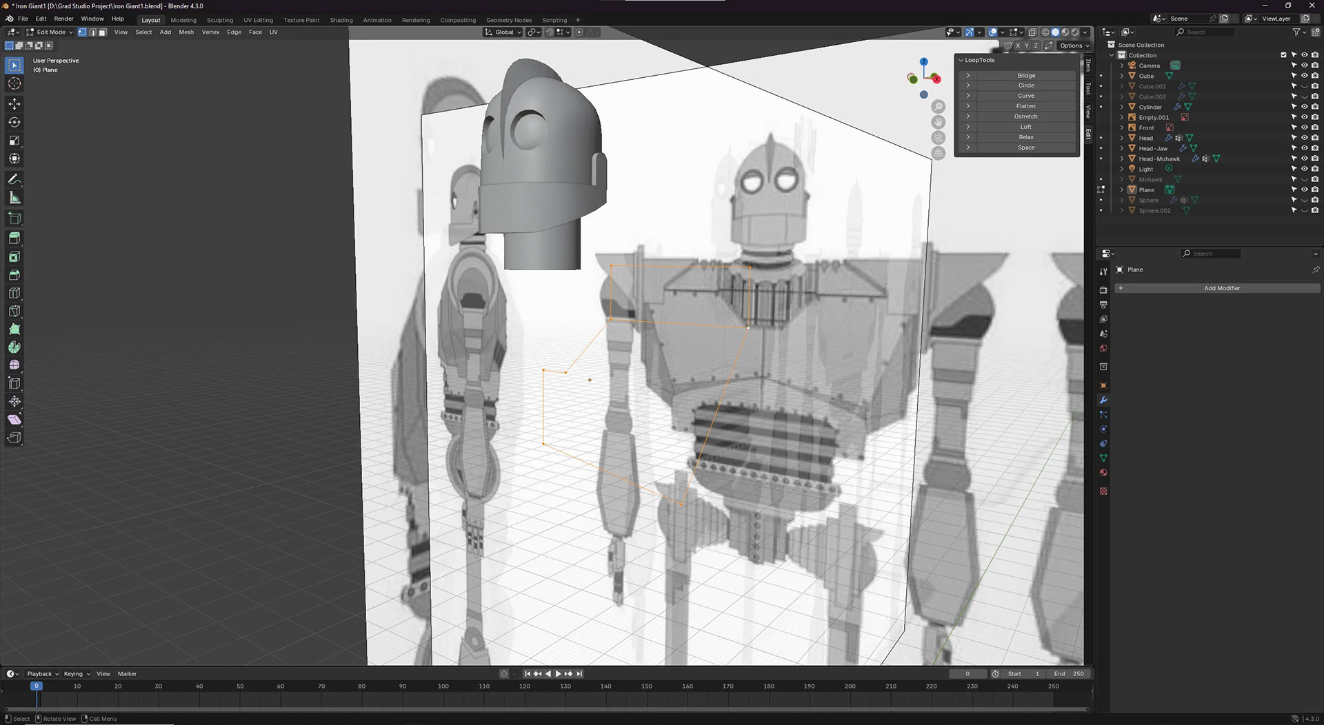 The project was divided by medium: My project partner, Colin, would design 2D, printed, and micro elements, while I focused on 3D, video, and macro elements. We agreed that the Giant should be the main focal point, so I began with 3D modeling him in Blender using as many reference shots and turnarounds as I could find.