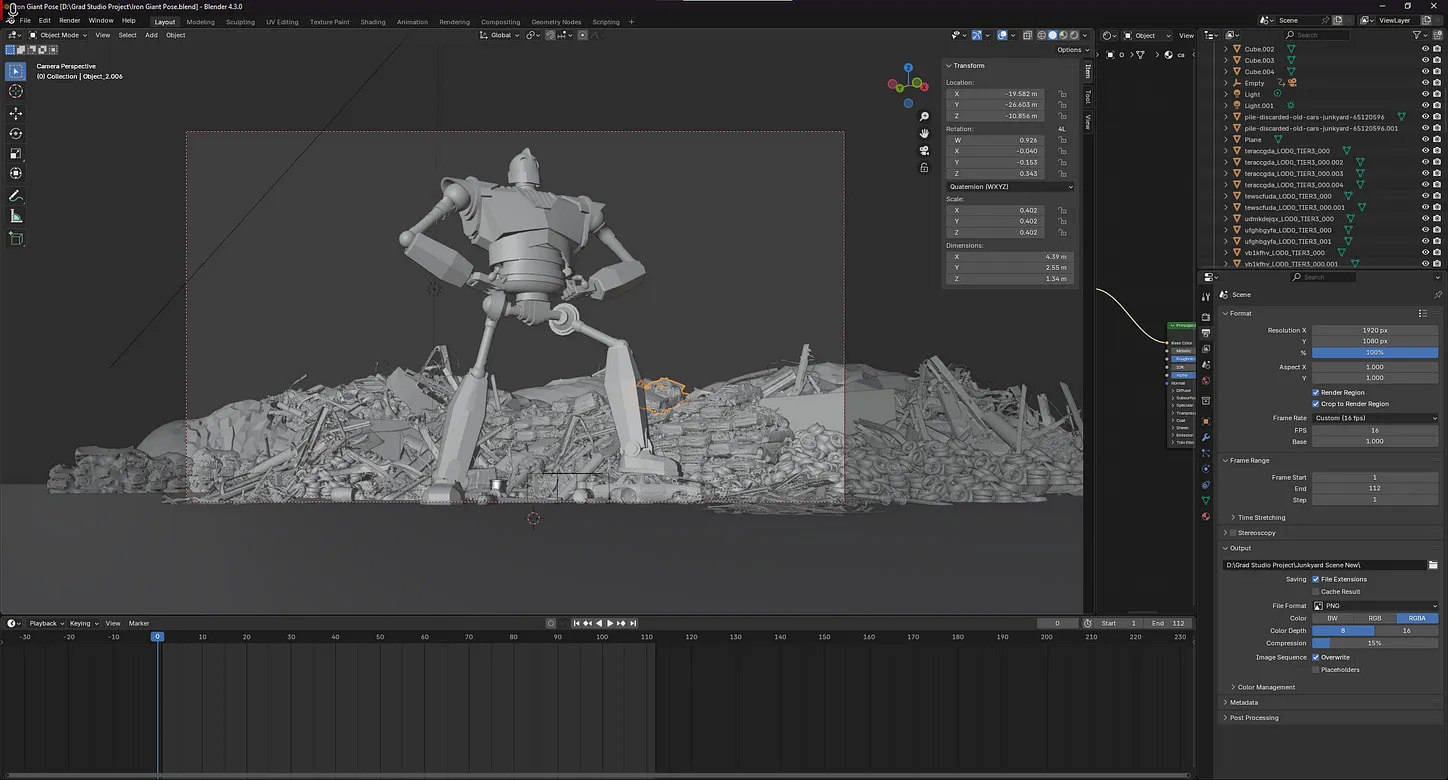 I ended up adding 4 additional shots. The rotating shot of the Giant in his Superman pose in the junkyard communicated the cult of personality theme mentioned prior. I did a close-up of the legs marching to create tension and to provide contrast in scale from the previous shot, going from macro to micro. I chose to do a close-up of his face, relating to a commonality I saw in propaganda videos of people looking off in the distance. Lastly, I added a shot with planes flying overhead after Colin mentioned that he discovered that during wartime, planes would deploy thousands of flyers via RISO printers inside open-door aircraft, which relates to his use of RISO in his flyers and newsprints, so I decided to communicate that relationship through animation. After I was done with all the shots, I noticed the Giant looked flat, since he was untextured except for glowing eyes and a metallic flat texture, so I ended up revisiting each shot and applying a worn metal normal map over him.\