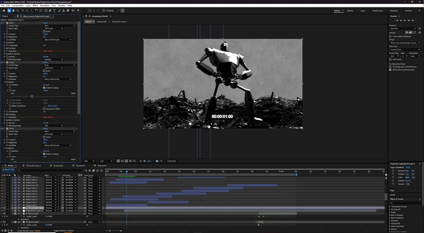 When I was done, I compiled all the shots into After Effects and began the editing process. Based on the feedback we got, Colin and I agreed that the footage should gradually deteriorate, relating to the theme of paranoia. I added a countdown sequence, which would be the anchor of the video, signifying where it began, since I planned for the footage to rewind to the beginning. Every time it would rewind, it would get more distorted. I would flash brief headlines on screen from time to time, relating to Colin’s printed work and adding a layer of dimensionality. I used a variety of effects on top of adjustment layers, such as fractal noise and Gaussian blurs, to create grainy footage. I made sure to end the video on the 00:10:4 second mark after it rewound for the last time, since October 4th was the launch of Sputnik, a prominent event of paranoia referenced throughout the film and in Colin’s work.
