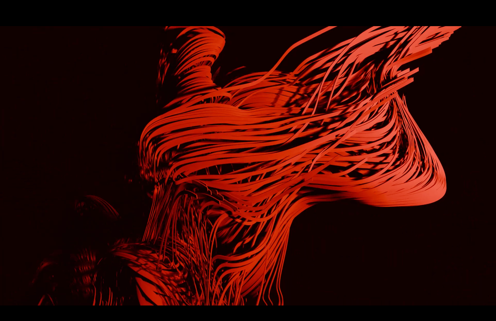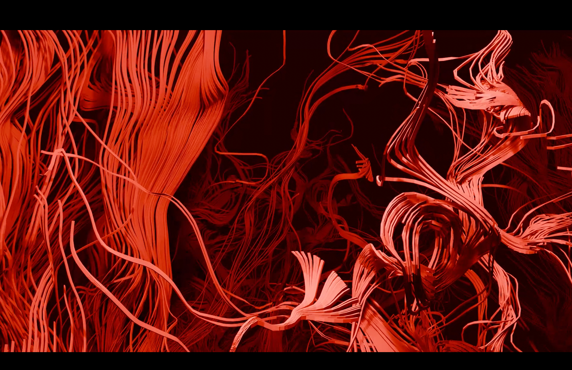 I decided to model and animate arrays of strings, since it also related thematically to my Independence and Authorship project. Going off these preliminaries, I knew the animation would have to be abstract and primarily red — connoting the strategic use of the color throughout my other project.